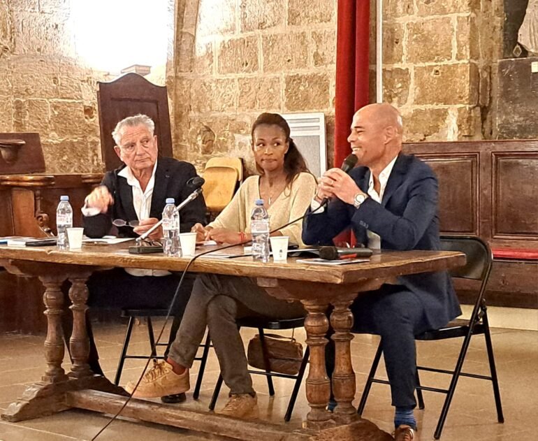 Alain Zylberman, président du consistoire régional, Rachel Khan, autrice du livre La culture de l’ultra-violence et Michaël Iancu, directeur de l’IUMAT.